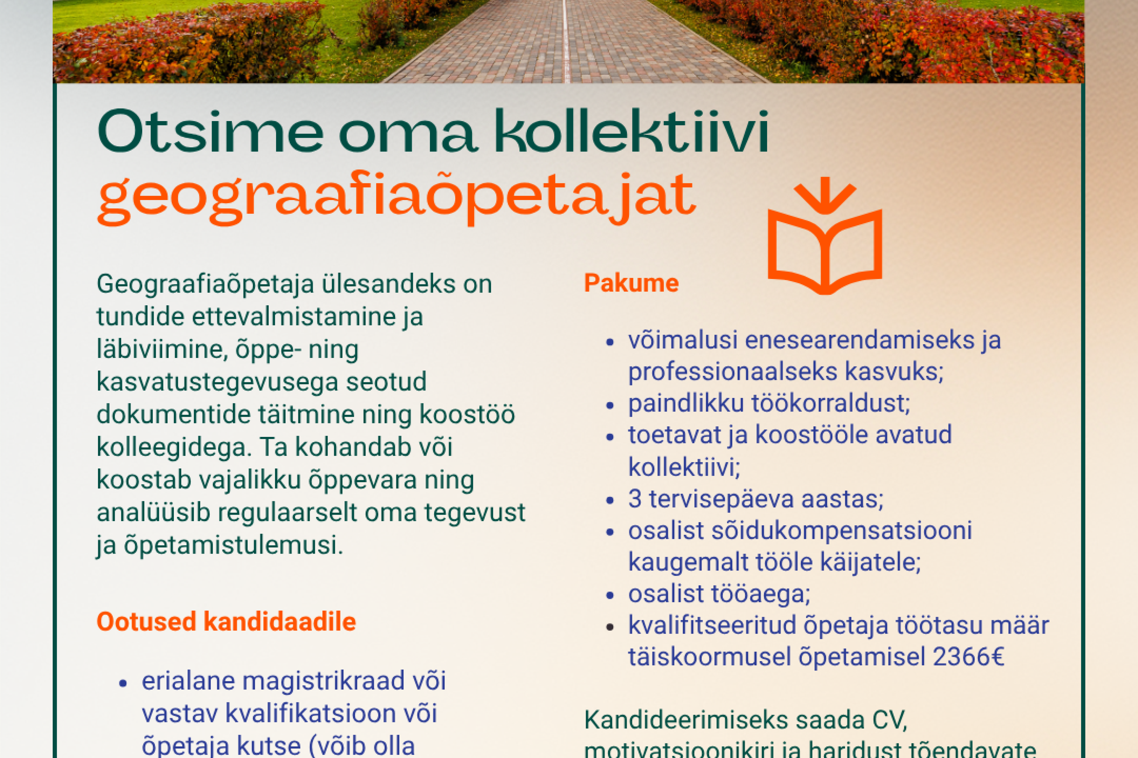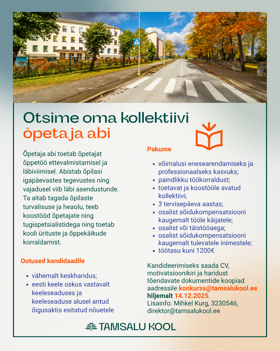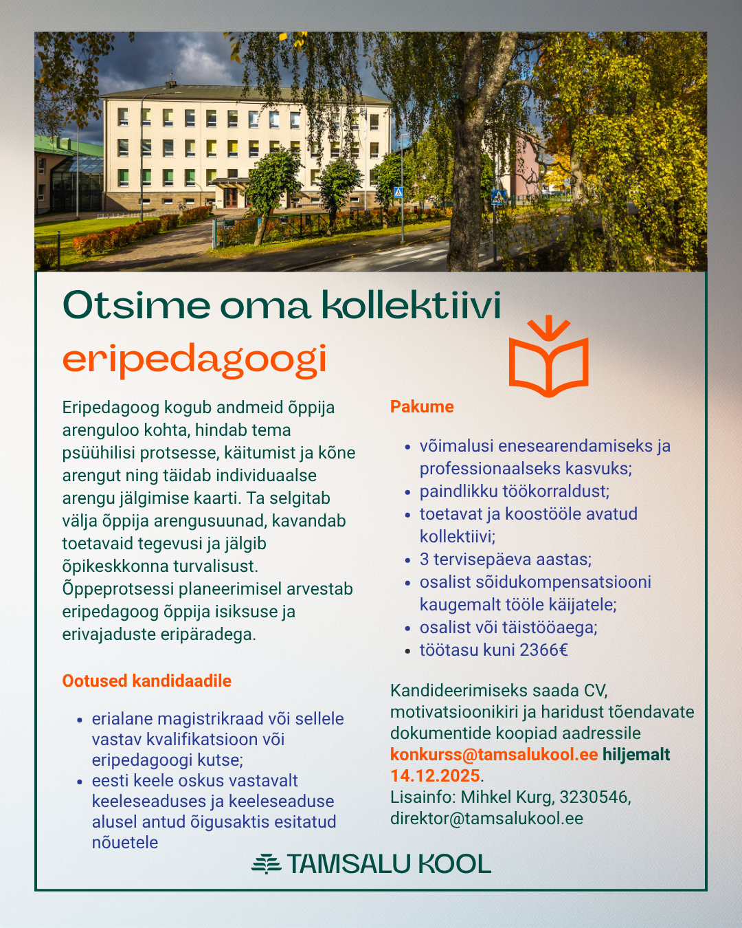 Tamsalu Kool on alates põhikoolina tegutsev, kvaliteetset haridusteenust ja mitmekülgseid enesearenguvõimalusi pakkuv haridusasutus. Ootame oma tiimiga liituma särasilmseid inimesi, kes on valmis ühiselt noorte arengusse panustama!
