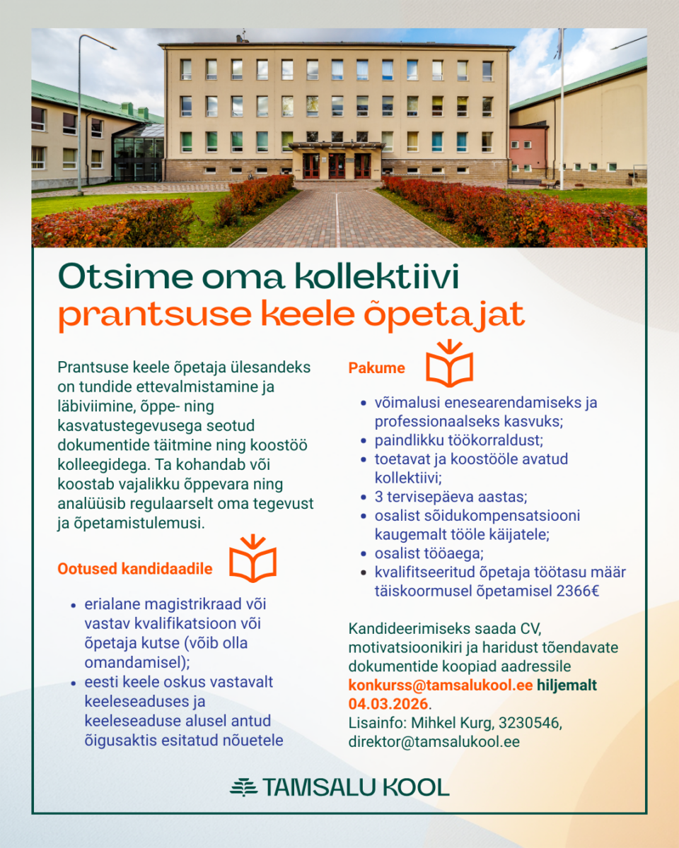 Tamsalu Kooli uus bränd osaleb 2026. aastal Eesti suurimal turundus- ja loovusvaldkonna konkursil Kuldmuna. Tegemist on iga-aastase loovusfestivaliga, kus tunnustatakse parimaid reklaami-, disaini- ja kommunikatsioonitöid üle Eesti. Konkursile esitati Tamsalu […]