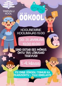 Õhtu jätkub eriti põnevalt – kell 19.00 algab ÖÖKOOL (30.–31. jaanuar), mis on mõeldud 1.–4. klassi õpilastele.