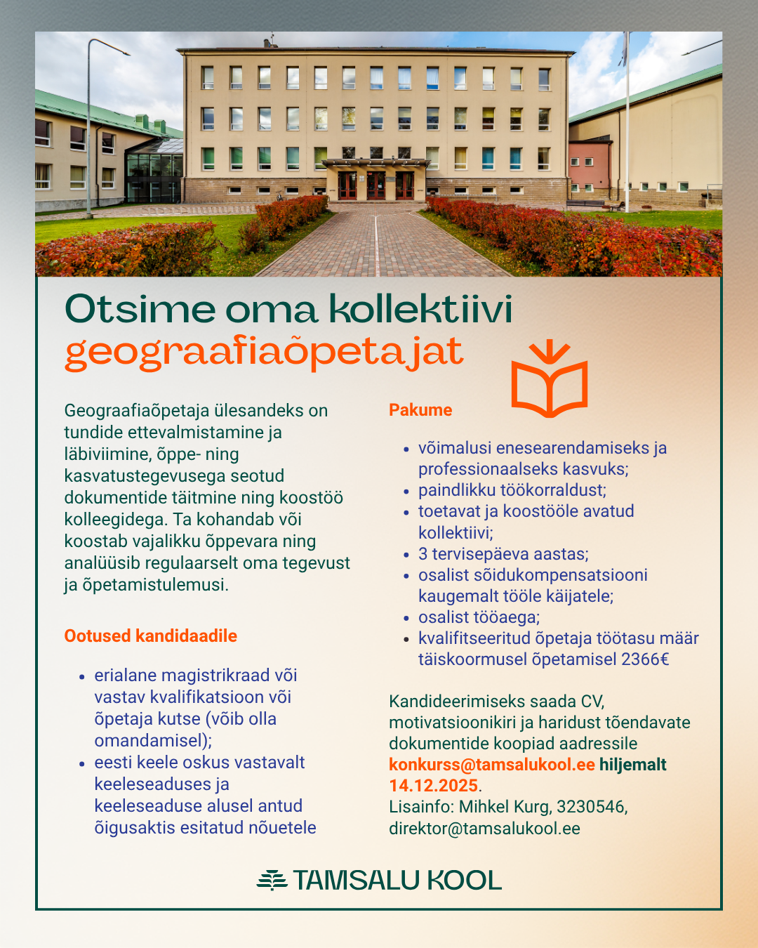 Tamsalu Kool on alates põhikoolina tegutsev, kvaliteetset haridusteenust ja mitmekülgseid enesearenguvõimalusi pakkuv haridusasutus. Ootame oma tiimiga liituma särasilmseid inimesi, kes on valmis ühiselt noorte arengusse panustama!
